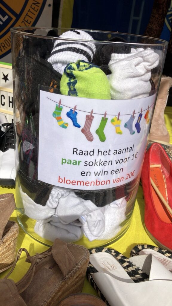 Veel mensen deden mee met het raden van het aantal sokken in de vaas. Door mee te doen, steunden ze ons financieel en konden ze een bloemenbon winnen.